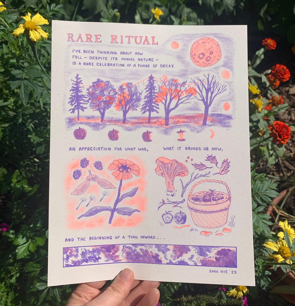 A two color risograph print by Grand Rapids artist, and Floral Observer contributor, Sara Nye. Sara's work work includes a mix of traditional and digital approaches, emphasizing linework and handmade textures. Sara holds a special interest in magical realism and cultivating comfort.